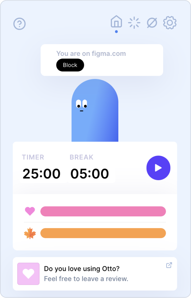 I've used Forest in the past, but I like the simplicity and UX of Otto better. I also really like the custom ppomodoro timer format. It has some quirks and bugs here and there, but overall the best productivity timer and website blocker I've used. I hope it stays this simple and doesn't get bloated with features.